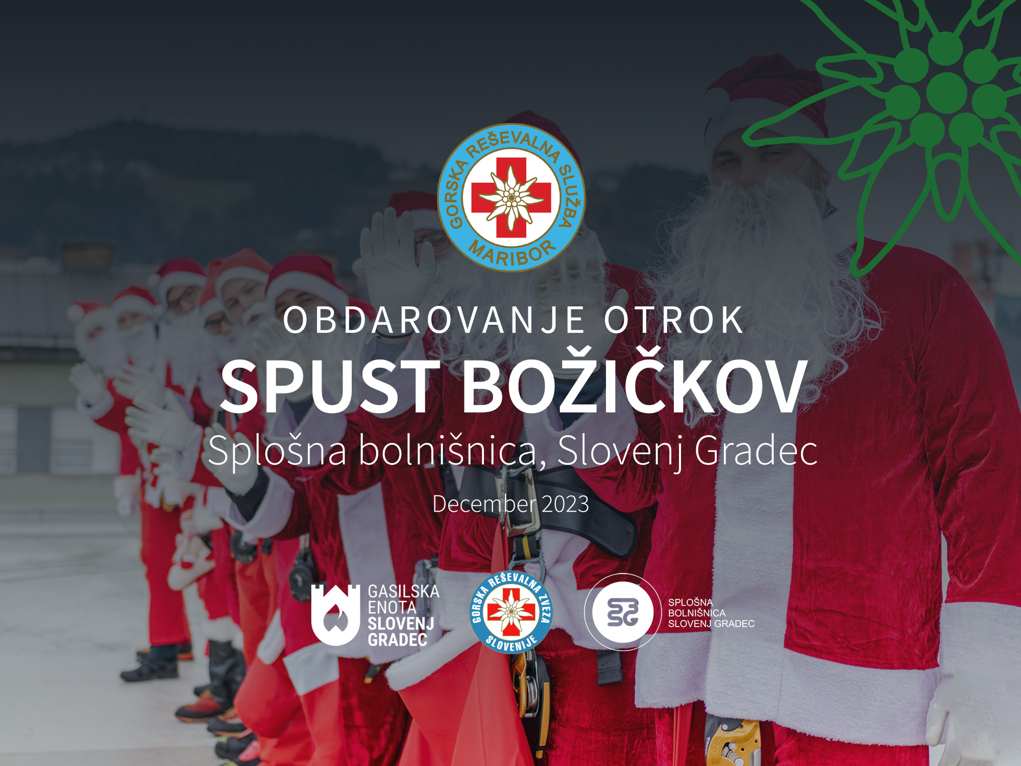 V prazničnem decembru smo člani GRS Maribor v sodelovanju z gasilsko enoto PGD Slovenj gradec, par dni pred božičnim večerom, postregli še z dodatno poslastico za najmlajše, namreč bili s(m)o priča tradicionalnemu spustu božičkov iz strehe/heliporta v okolici Splošne bolnišnice Slovenj Gradec, kjer smo razveseljevali in obdarovali otroke različnih starostnih skupin. Nasmejani in neučakani obrazi so nas spremljali vse do zaključka, s tem so nepopisno napolnili naša srca in nam dali popotnico, da se vsakič znova z veseljem vrnemo.